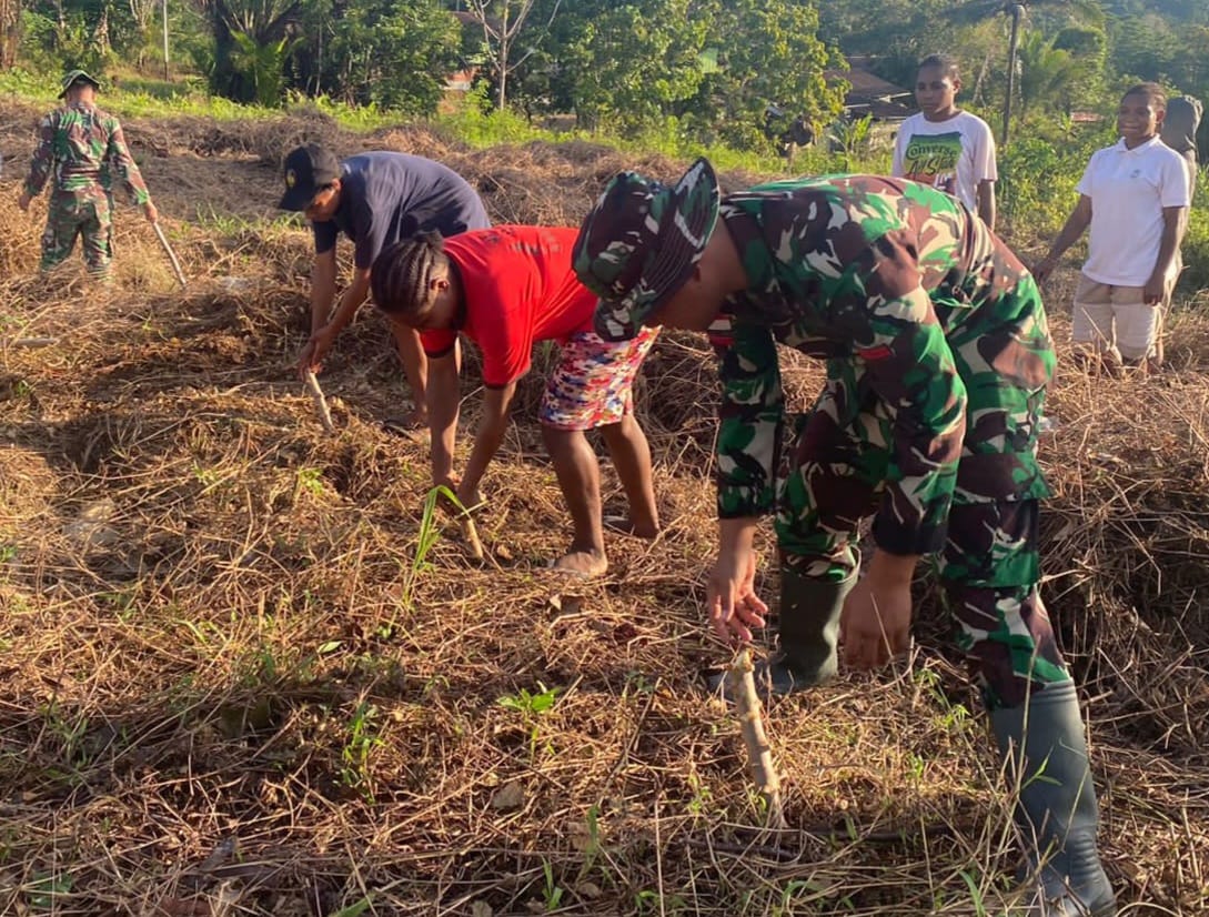 Kegiatan yang dipimpin oleh Danpos Ubrub Satgas Yonif 143/TWEJ Sertu Afnan bersama para pemuda dengan penuh semangat bekerjasama membuka lahan kosong untuk ditanami Singkong sebagai persediaan makanan masyarakat Kampung Umuaf.