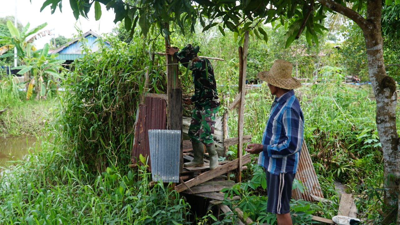 Kapuas,- TNI Manunggal Membangun Desa (TMMD) Ke 110 Kodim 1011/KLK, seperti biasanya kembali melanjutkan aktivitasnya Selasa (16/3/2021). Praka Qodri nampak dengan sukarela membantu Marsito (47) membongkar jamban lama yang memang tidak layak untuk digunakan.