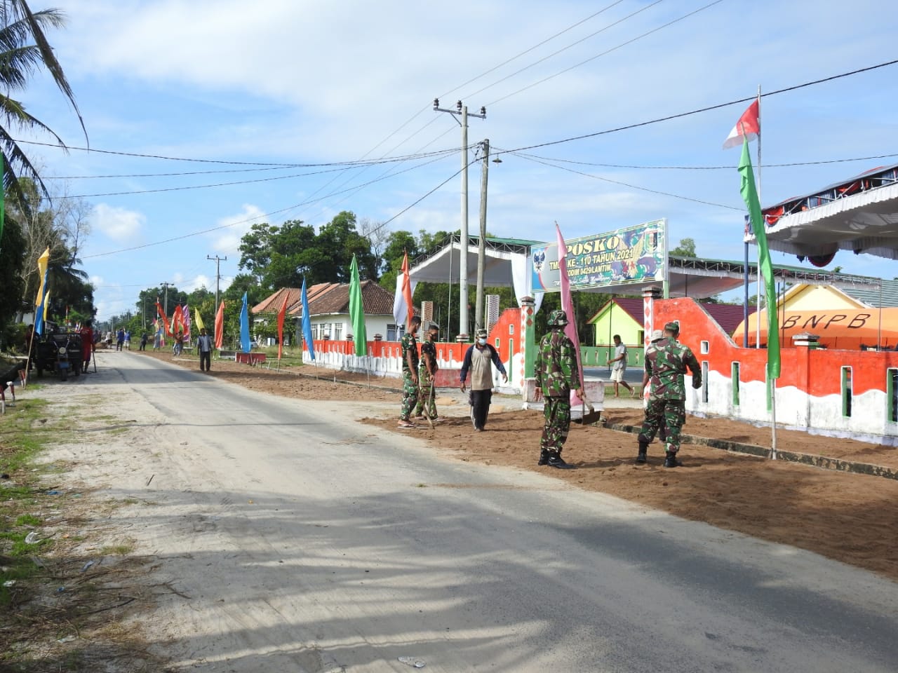 Lampung Timur, Setelah melaksanakan pengecatan pagar, Satuan Tugas (Satgas) TNI Manunggal Membangun Desa (TMMD) 110 Kodim 0429/Lamtim kembali melaksanakan karya bhakti bersama masyarakat di halaman balai desa Sukorahayu, Kecamatan Labuhan Maringgai, Lampung Timur, Minggu (21/3/2021).