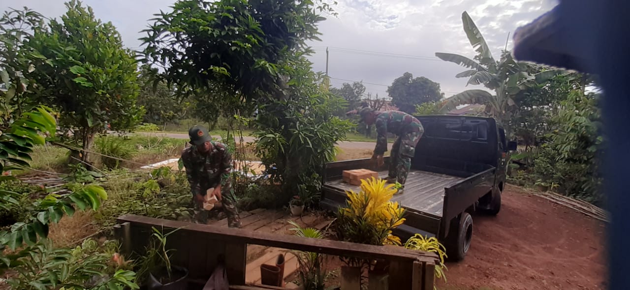 Serda yoseph yang tergabung dalam Satgas TMMD ikut membantu memindahkan bahan material berupa batu bata yang akan digunakan untuk membangun MCK agar lebih dekat dalam pengambilan untuk di susun di lokasi yang sedang direhab.