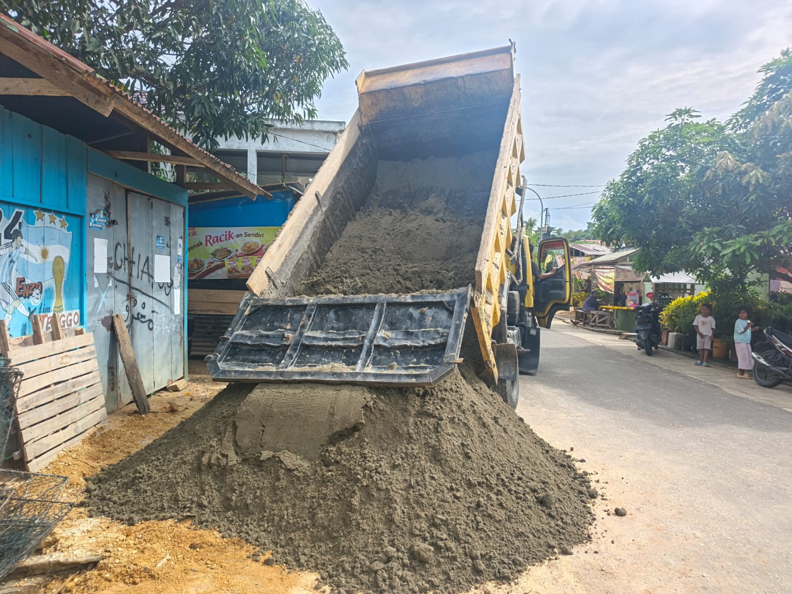 Sejumlah material konstruksi tampak terus dilangsir secara berkala menuju titik pengerjaan guna memastikan seluruh target infrastruktur dapat selesai tepat waktu.