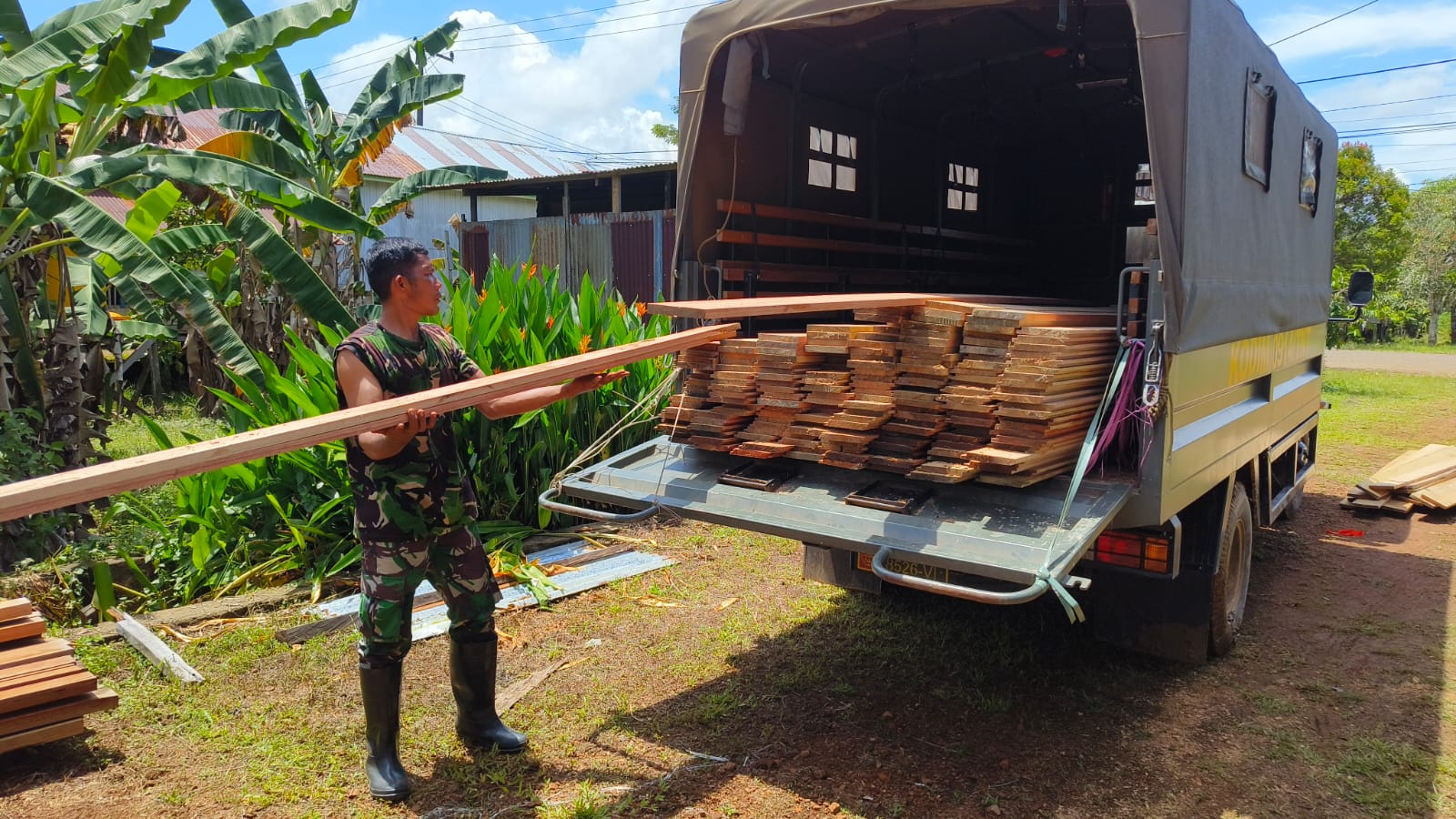 Kayu papan yang akan digunakan tentunya sangat banyak dengan tujuan pelaksanaan merehabilitasi rumah tak layak huni sesuai traget yang diharapkan ,Anggota Satgas TMMD Reg 122 mengecek kayu papan sebagai bahan laporan ke komandan Satgas TMMD bahwa bahan material yang didistribusikan sudah sampai dilokasi dan dicek sesuai jumlah yang dikirim dan akan dilaporkan.