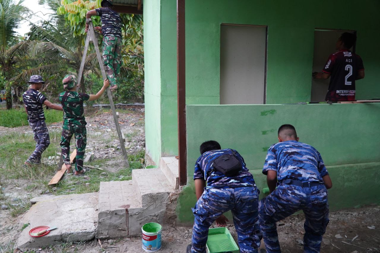 Sambas – Pengerjaan rehabilitasi MCK (Mandi, Cuci, Kakus) di salah satu sekolah dasar yang menjadi sasaran fisik program TNI Manunggal Membangun Desa (TMMD) ke-126 Kodim 1208/Sambas kini telah hampir selesai dikerjakan oleh Satgas TMMD sekarang Satgas melakukan tahap akhir Pengecetan bangunan, Minggu (2/11/2025).