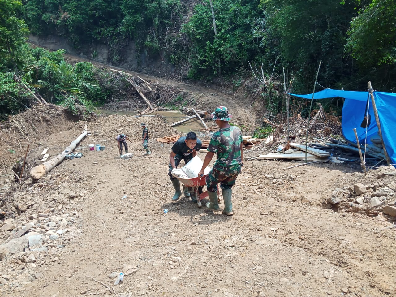 Ditengah kesulitan masuknya distribusi material justru terjadi kebersamaan antara masyarakat dengan TNI dan Polri, salah satunya pada kegiatan distribusi material Pembuatan Talud yang harus diangkat bersama sama antara masyarakat dan TNI dengan mengunakan sepeda motor dan gerobak.