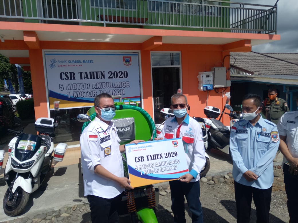 Kliksumatera.com, PAGARALAM- Pemerintah Kota Pagaralam Menerima Bantuan 5 Unit Motor Ambulance dan Satu Unit Motor Damkar dari BUMD Bank Sumsel Babel Cabang Kota Pagaralam dari Sumber dana Corporete Sosial Responsilibity (CSR) diterima langsung oleh Walikota Pagaralam Alpian Maskoni didampingi Sekretaris Daerah Syamsul Bahri, Kepala Bappeda Novi Apriadi beserta pejabat lainnya, Rabu (17/3/2021).