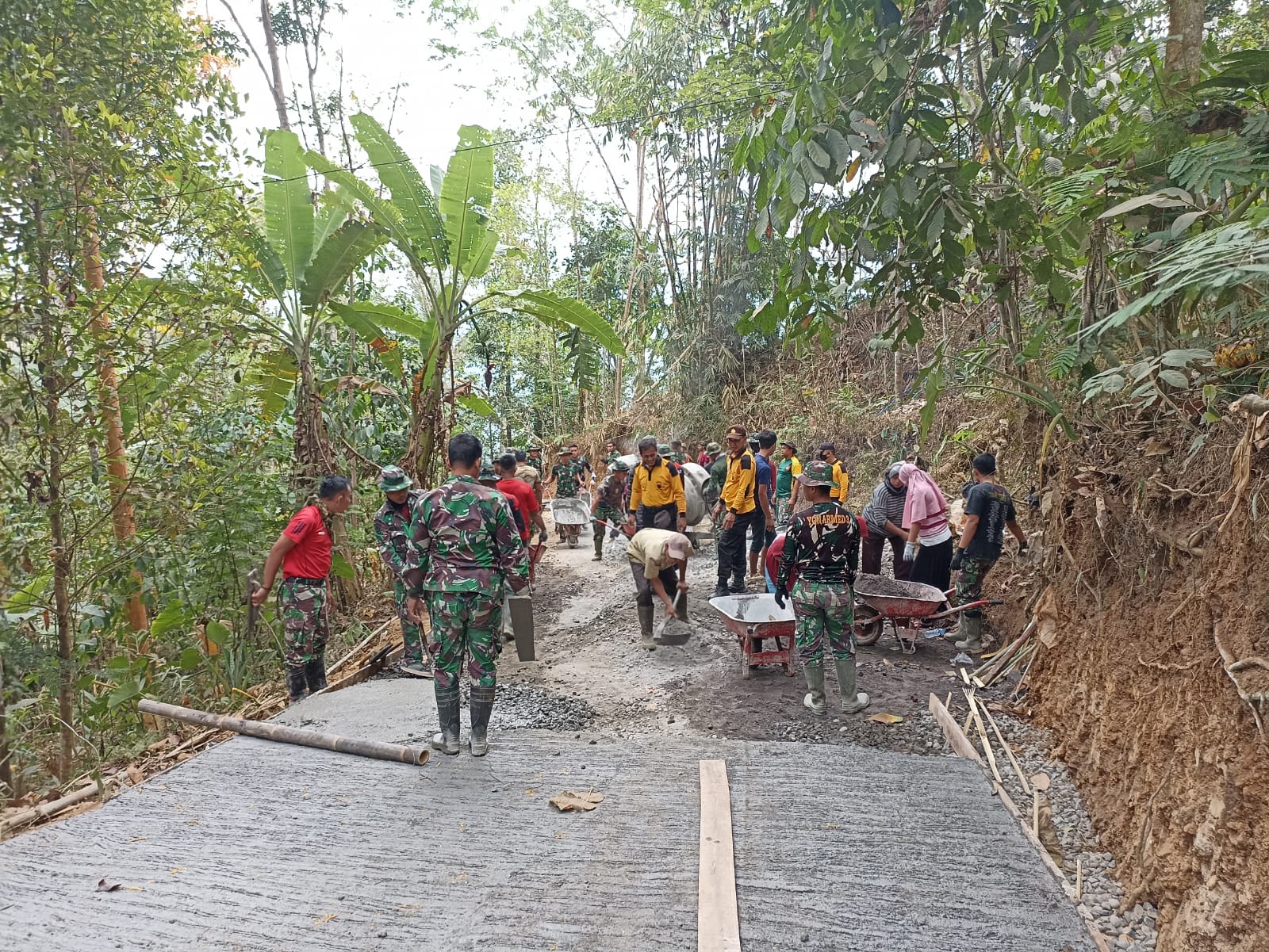Satgas TMMD dengan di bantu masyarakat difokuskan pengerjaan pengecoran jalan,”Mereka saling bahu-membahu bergotong-royong bergantian ada yang menyiapkan material dan ada yang masukkan material ke adukan molen biar tercampur rata dan hasilnya bisa maksimal.