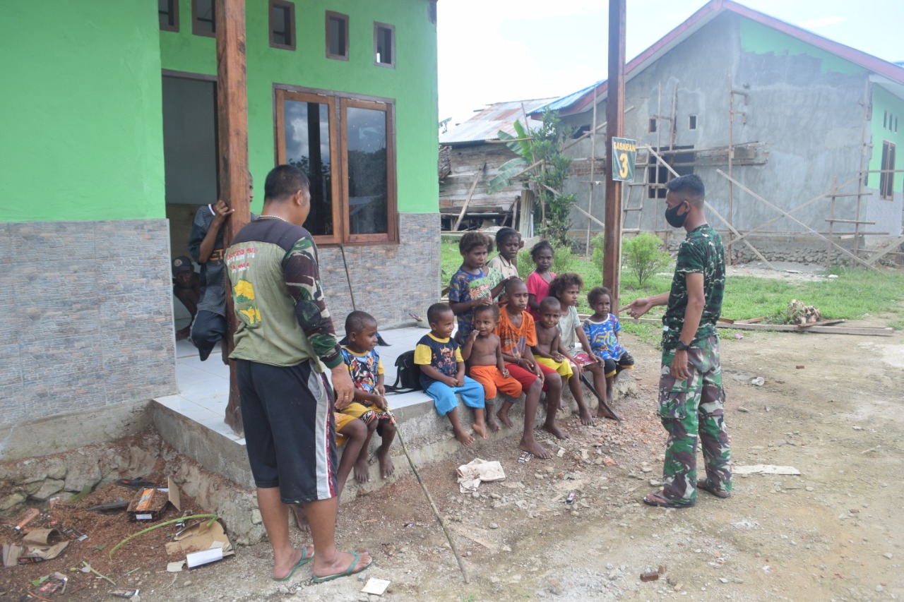 Sorong, Papua Barat. – Serda Sumario anggota Satgas TNI Manunggal Membangun Desa (TMMD) mengibur anak-anak di Kampung Kamlin Distrik Wemak Kabupaten Sorong, Sabtu (27/03/2021).