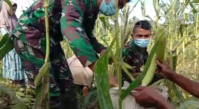 Koptu Dedi Irawan, Selasa (13/7/2021), mengisi waktu senggang, Satgas membantu petani panen jagung.