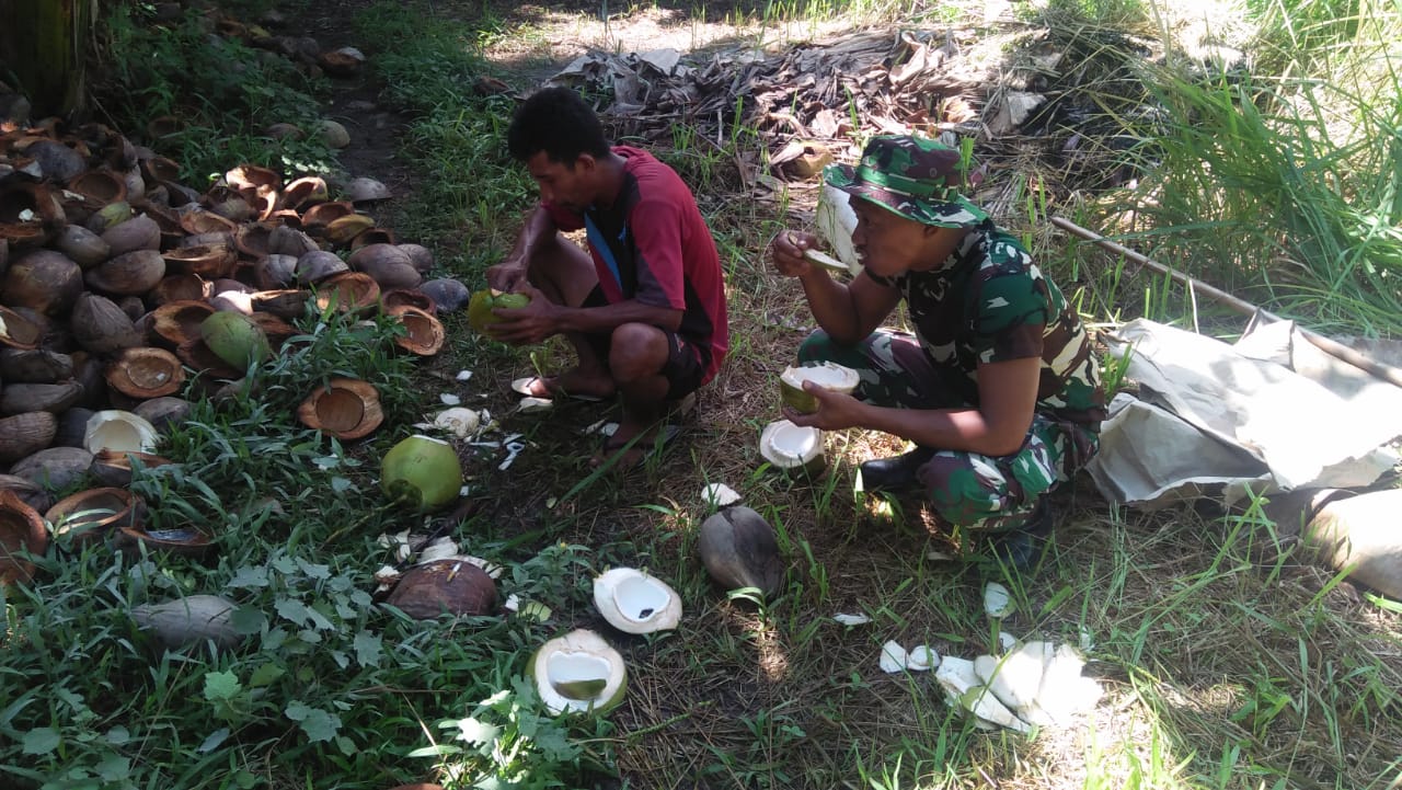 Nikmatnya air kelapa muda ini, diakui anggota satgas TMMD bersama-sama warga. Di momen ini jalinan kekeluargaan antara TNI dan rakyat sangat kentara.