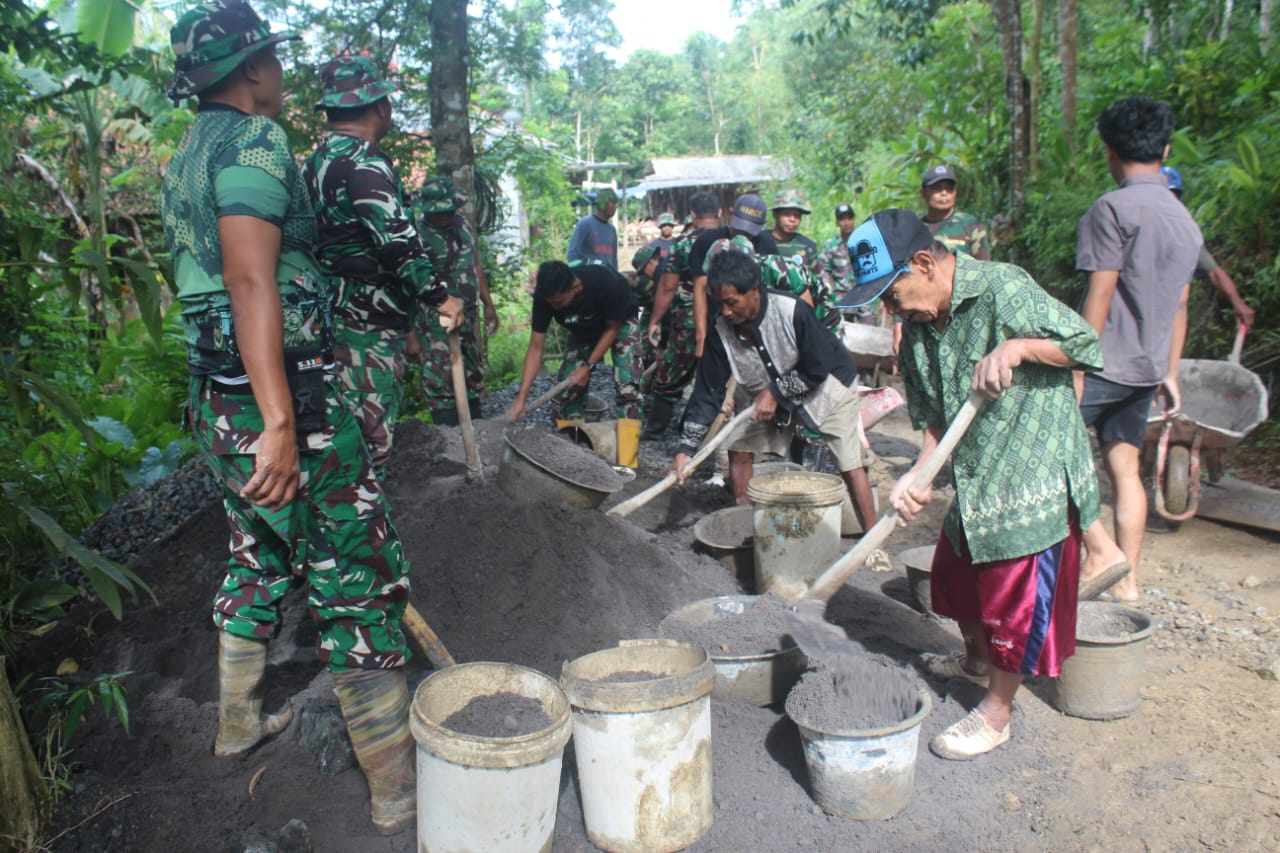 Sepatu lapangannya sesekali menyentuh tanah lembap. Namun langkahnya tak ragu—mantap seperti tekad yang ia bawa. Di kanan-kiri, prajurit Satgas TMMD terus bekerja, mengaduk semen, meratakan rabat beton, dan menata harapan yang perlahan mulai berwujud.