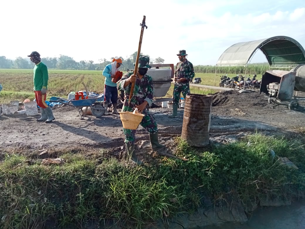 PATI – Meski mesin penyedot air rusak, namun pekerjaan pengecoran jalan di Desa Tamansari, Kecamatan Jaken, Kabupaten Pati itu tetap dilaksanakan oleh Satgas TMMD Reguler ke-111 Kodim 0718/Pati. Dalam mengatasi hal itu, personel Satgas TMMD bahu membahu mengambil air guna keperluan adukan semen dan mengisi air pendingin mesin molen.