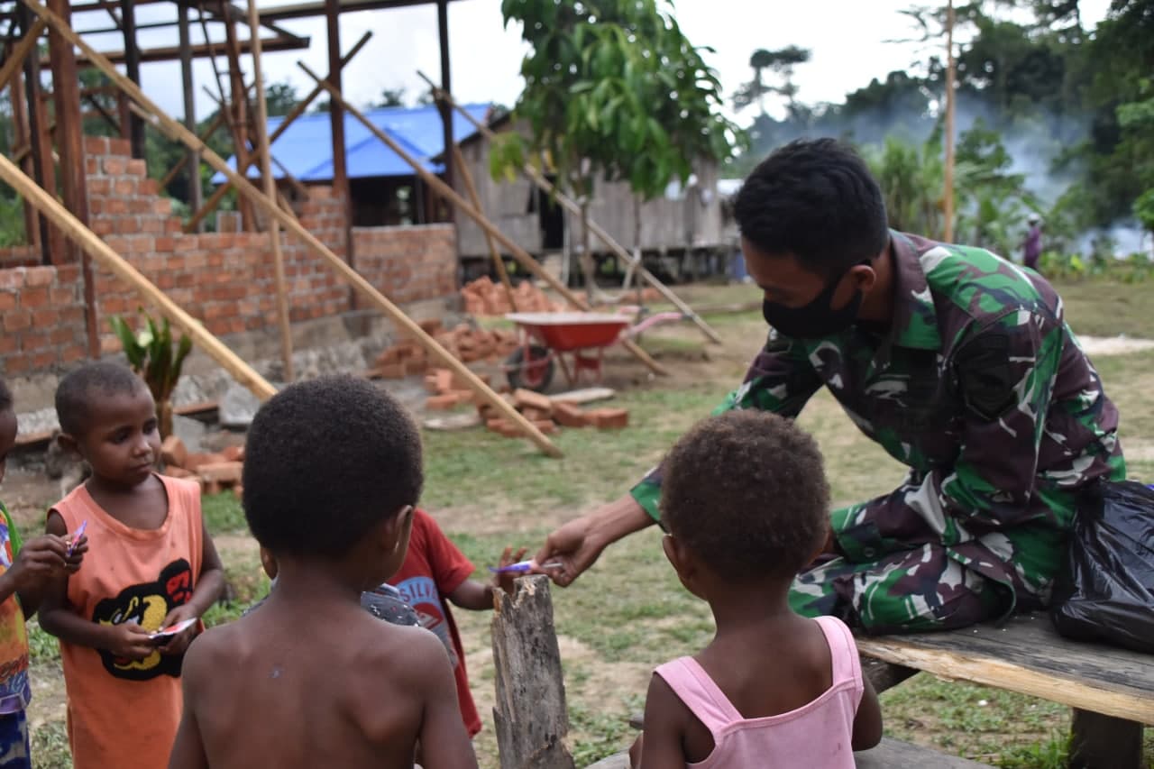 Sorong, Papua Barat. – Upaya untuk mewujudkan kemanunggalan terhadap masyarakat, di sela sela tugas yang begitu sibuk, personil Satgas TMMD Ke 110 Kodim 1802/Sorong wajib melaksanakan komunikasi sosial baik kepada masyarakat umum termasuk anak-anak yang berada di lokasi TMMD Kampung Kamlin Distrik Wemak Kabupaten Sorong.