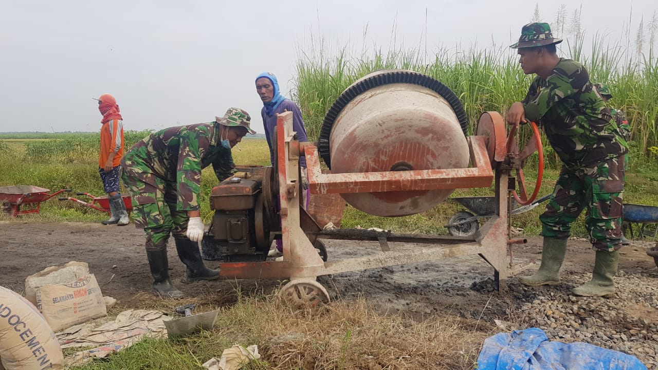 Pati – Pagi ini Praka Agus Purwinto anggota satgas TMMD reg 111 Kodim Pati, setelah apel pagi selesai bergegas mengambil tuas engkol mesin molen. Suara molen yang menderu membuat anggota yang lain pun segera mengambil peralatan dan semen untuk membuat adonan pengecoran. Saat ini pengecoran pembangunan jalan betonisasi sudah memasuki hari ke sebelas setelah dibukanya TMMD secara resmi, Jum’at (25/06/2021).