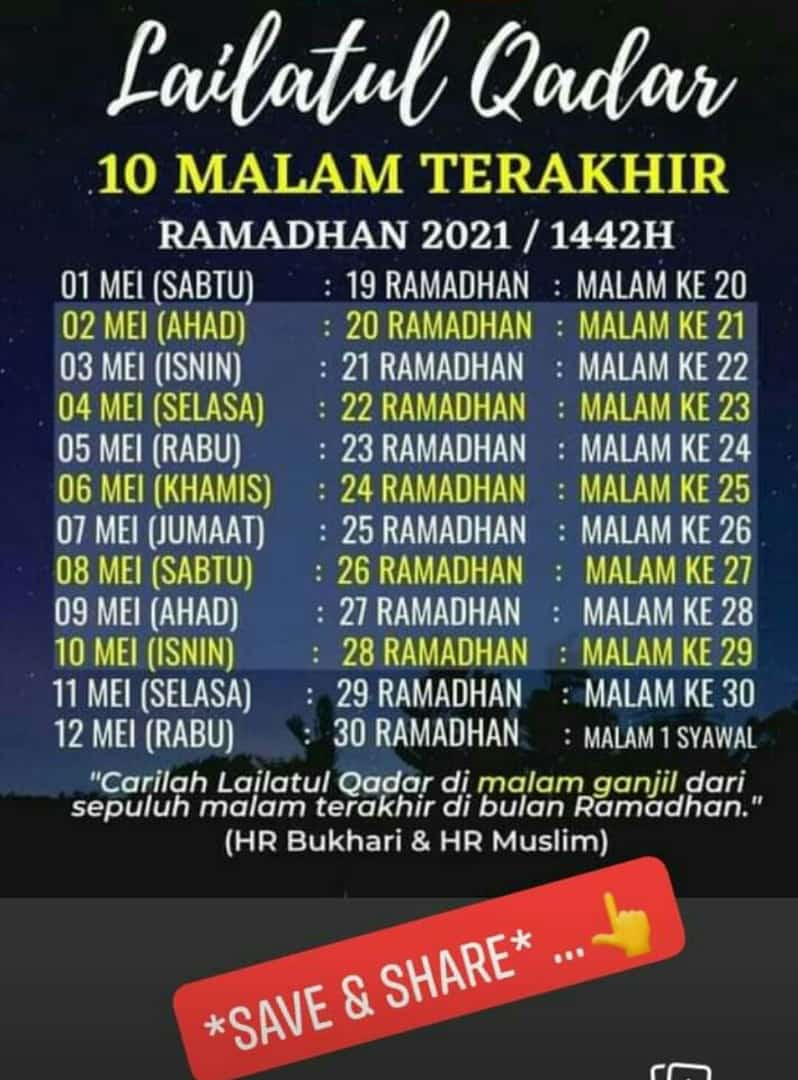 Adapun, berdasarkan rujukan Rasullullah akan datangnya malam Lailatul Qadar, maka malam Lailatul Qadar jatuh di tanggal 21, 23, 25, 27 dan 29 Ramadan. Sementara pada kalender masehi akan jatuh di tanggal 3, 5, 7, 9 dan 11 Mei.