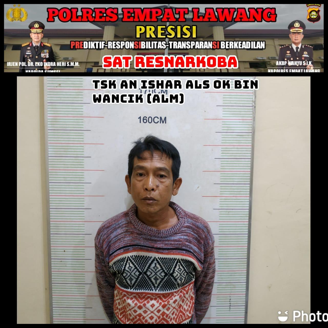 Kliksumatera.com, EMPAT LAWANG- Is Alias Ok (51) warga Talang Jerambah Desa Tanjung Agung Kecamatan Ulumusi Kabupaten Empat Lawang yang sudah menjadi salah satu Target Operasi (TO) dari Satresnarkoba Polres Empat Lawang, akhirnya berhasil ditangkap Polisi berdasarkan informasi dari masyarakat dan Lp-A / 31 / VI /SPKT.SATNARKOBA/RES EMPAT LAWANG/SUMSEL, tgl 26 Juni 2021.