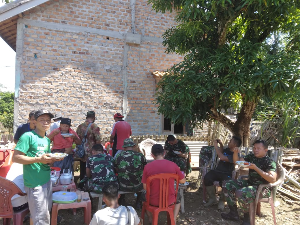 Prajurit TNI Kodim 0427/Way Kanan yang tergabung dalam Pra TMMD ke-111 terlihat kompak bersama warga Kampung Negeri Batin, Kecamatan Umpu Semenguk, Kabupaten Way Kanan, saat makan siang di halaman rumah Ibu Misnariah, salah satu warga penerima Rehab RTLH pada Program Pra TMMD ke-111 Kodim 0427/Way Kanan. Rabu (9/6/2021)