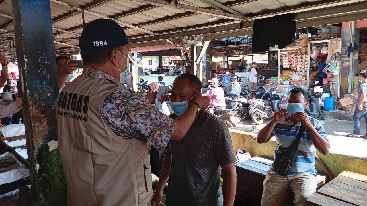 Dinas perdagangan Kabupaten Ogan Komering Ilir bersama Satuan Polisi Pamong Praja dan Damkar OKI mendisiplinkan para pedagang dan pengunjung pasar Kayuagung, Jumat (25/6).
