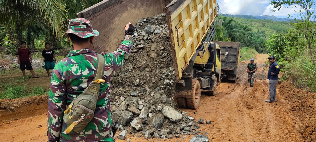 Selain dibantu alat berat, pembukaan badan jalan yang melibatkan personil Satuan Tugas (Satgas) TMMD juga dibantu masyarakat sekitar. Terlihat personel Satgas bersama warga, membantu mobilitas dan memperlancar material masuk di lokasi pengerasan jalan.