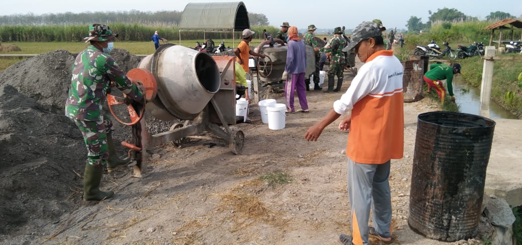 Pati – Kebersamaan yang dilakukan oleh anggota satgas TNI Manunggal Membangun Desa ( TMMD ) Reguler ke -111 Kodim 0718/Pati dengan warga Desa Tamansari, Kecamatan Jaken, Kabupaten Pati, di pengerjaan pembangunan fisik Pengecoran jalan terus digenjot untuk sukseskan Program TMMD, Sabtu (26/6/2021).