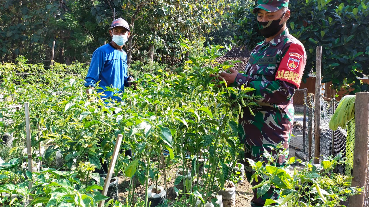 Dibantu Sertu Jumroni Babinsa desa Tamansari yang sekaligus anggota satgas TMMD Kodim Pati, Sapari memetik buah cabai miliknya. “Cukup dengan polybag dan penyiraman air yang cukup Insya Allah gampang pak menanam cabai, tapi kendalanya adalah ayam di kampung kalau tidak dikasih jarring bisa-bisa tanaman rusak,”Kata Sapari.