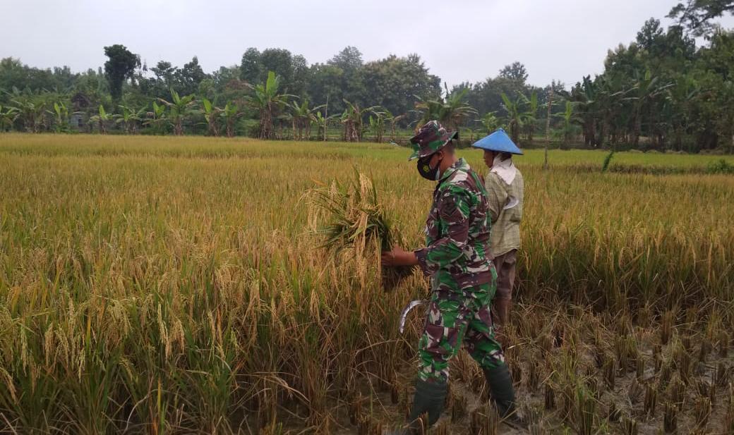 Satgas TMMD Kodim 0813/Bojonegoro, Serda Lajahidin nampak bersama warga sedang melakukan potong padi bersama petani yang disawah warga.
