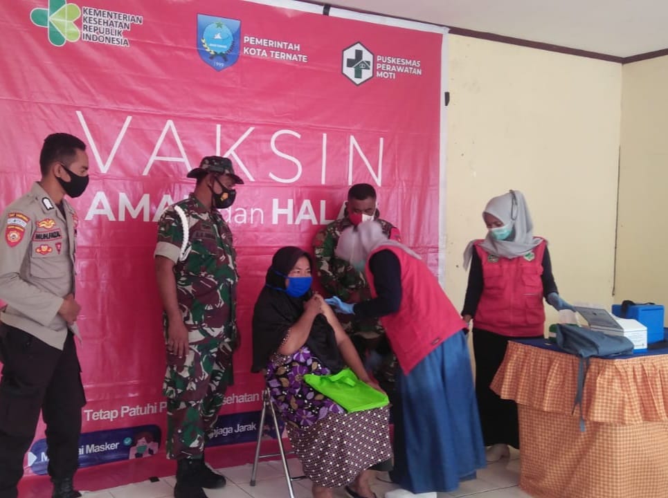 Satgas TNI Manunggal Membangun Desa (TMMD) Kodim 1501/Ternate memantau pelaksanaan Vaksinasi Covid-19 tahap I yang dilaksanakan oleh UPT Puskesmas, Kecamatan Moti, Selasa Pagi (29/6/2021).