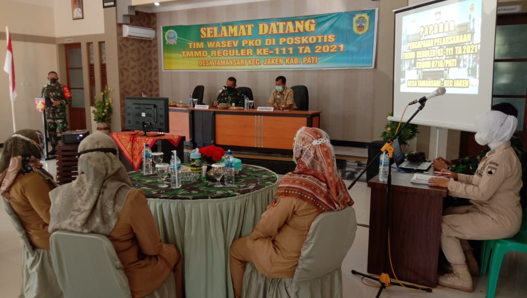 Pati – Dansatgas TMMD Reguler Ke-111 Letkol Czi Adi Ilham Zamani, S.E., M.I.Pol. menyambut langsung kunjungan kerja Tim Pengawasan dan Evaluasi (Wasev) Itdam IV/Diponegoro di lokasi TMMD 111 di Desa Tamansari, Kecamatan Jaken, Kabupaten Pati. Selasa (22/6/2021)