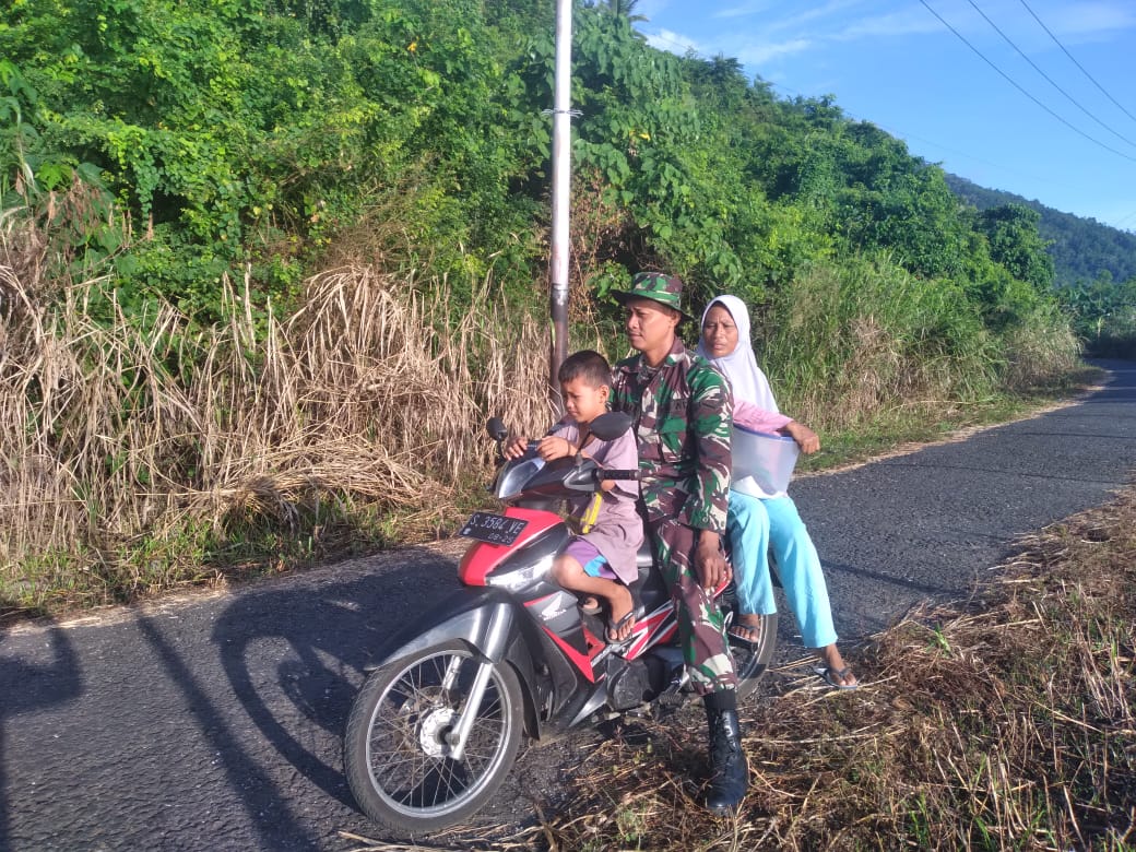 Kepedulian ini terlihat saat salah seorang warga (Ibu2 & anaknya) sedang berjalan kaki menuju ke kebun yang jaraknya lumayan jauh & tdk ada kendaraan sm sekali dikarenakan jalan setapak yg biasa dilaluinya msh dalam tahap pengerjaan. Sehingga salah satu anggota satgas yang melihat Membantu warga tersebut untuk mengantarkannya sampai ke tujuan.