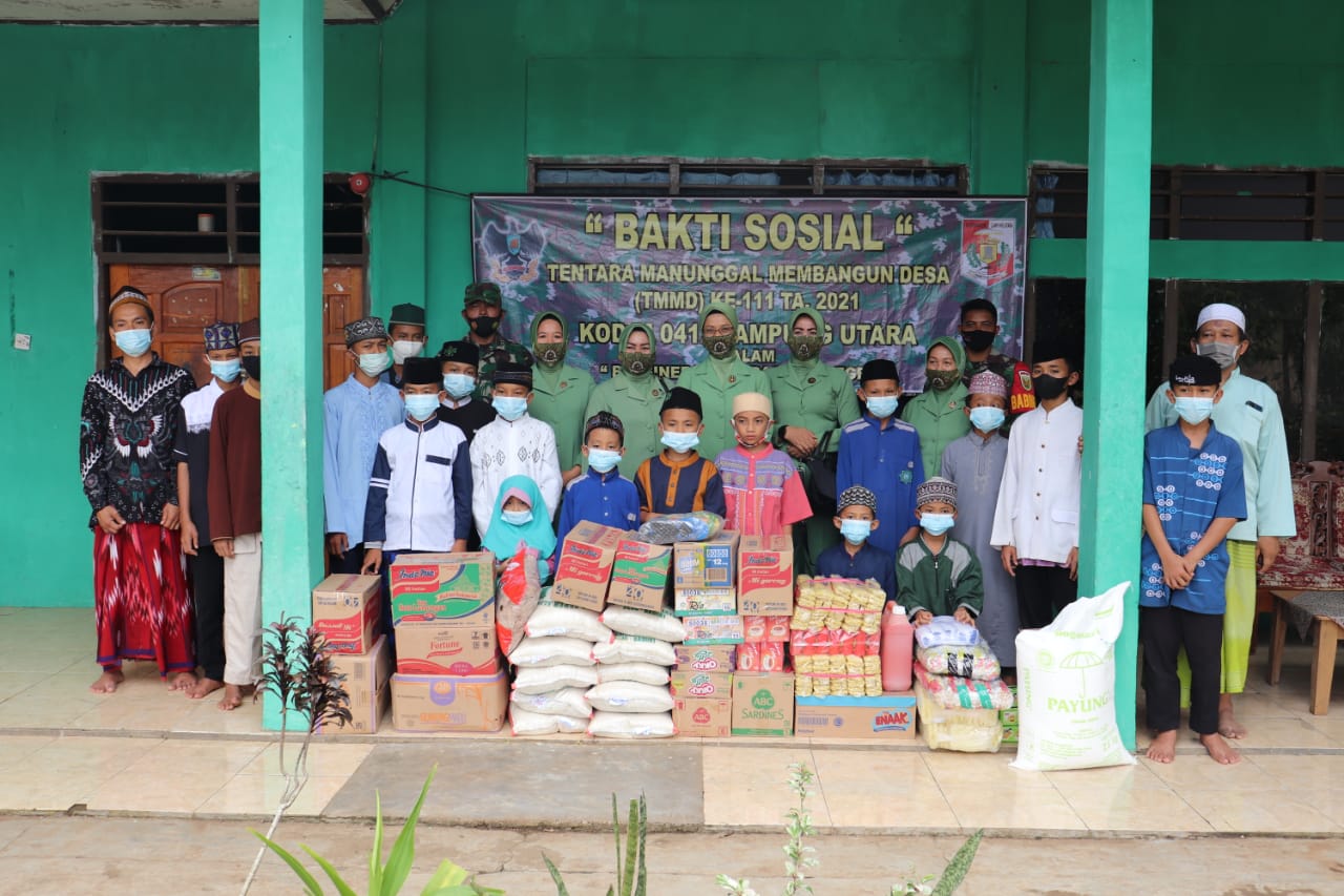 Suasana TMMD Ke 111 di Pandemi Covid-19 Kodim 0412/LU melaksanakan bakti sosial pembagian sembako kepada anak anak Yatim Panti Asuhan Al-Mursin.