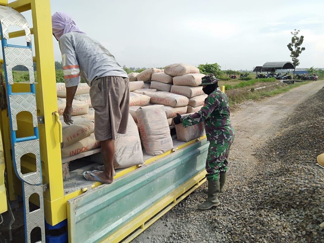 Terlihat sangat antusias penuh semangat antara anggota satgas TMMD dan warga Desa Tamansari, Kecamatan Jaken, Kabupaten Pati, yang menurunkan dan mengangkat material semen, Selasa, 22 Juni 2021, (pendimpati).