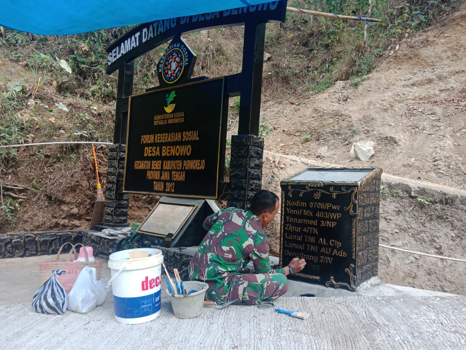 Kegiatan Satgas TMMD 118 Purworejo dengan merenivasi batas tugu desa dalam Perhatian dan menumbuhkan kepedulian kemasyarakat Desa Benowo tentang pentingnya menjaga memelihara dan mengamankan aset Desa .