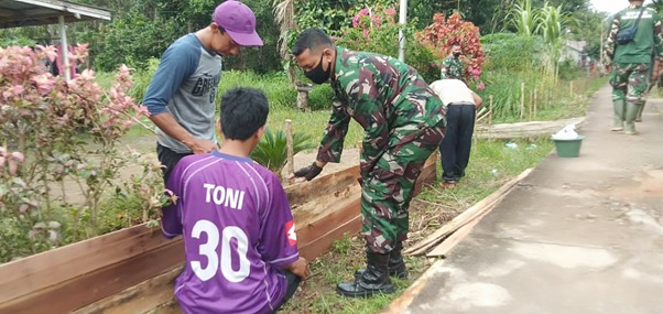 Tampak Sertu Yudi anggota Koramil 1207-06/Sungai Ambawang bersama Hasan (45 tahun) sedang mempersiapkan pemasangan papan mal pembatas untuk pengecoran jalan rabat beton di Dusun Maju Jaya, Desa Kuala Mandor B, Kec. Kuala Mandor B, Kab. Kubu Raya.