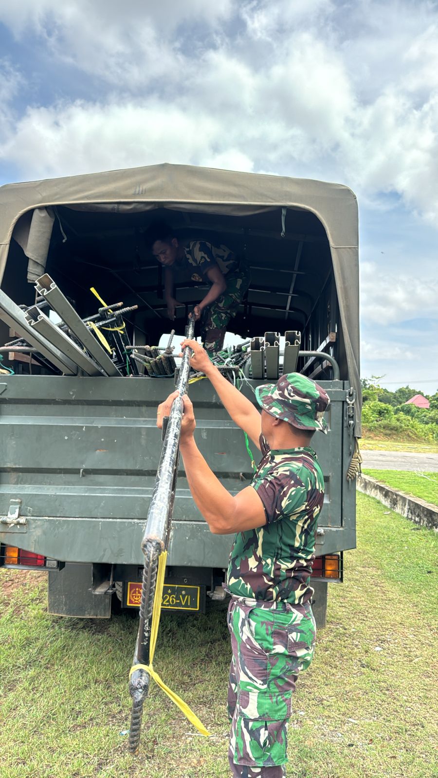 Terlihat beberapa anggota Satgas TMMD sedang menurunkan rangka-rangka tenda untuk tamu undangan dan lainnya. Hal tersebut dilakukan untuk kesuksesan pelaksanaan Upacara Penutupan TMMD.