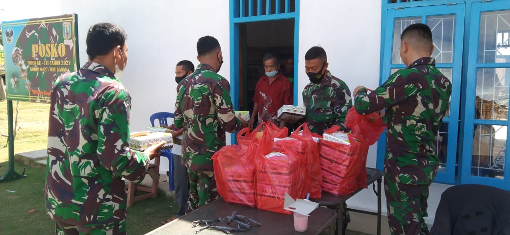 WAY KANAN – Sebagai bentuk kepedulian terhadap warga anggota Satgas TMMD ke-111 Kodim 0427/Way Kanan melaksanakan pembagian nasi kotak kepada warga yang telah hadir mengikuti pelatihan pembuatan pupuk organik cair dan pakan permentasi di Aula Balai Kampung Negeri Batin Kecamatan Umpu Semenguk, Kabupaten Way Kanan. Senin (21/6/2021)