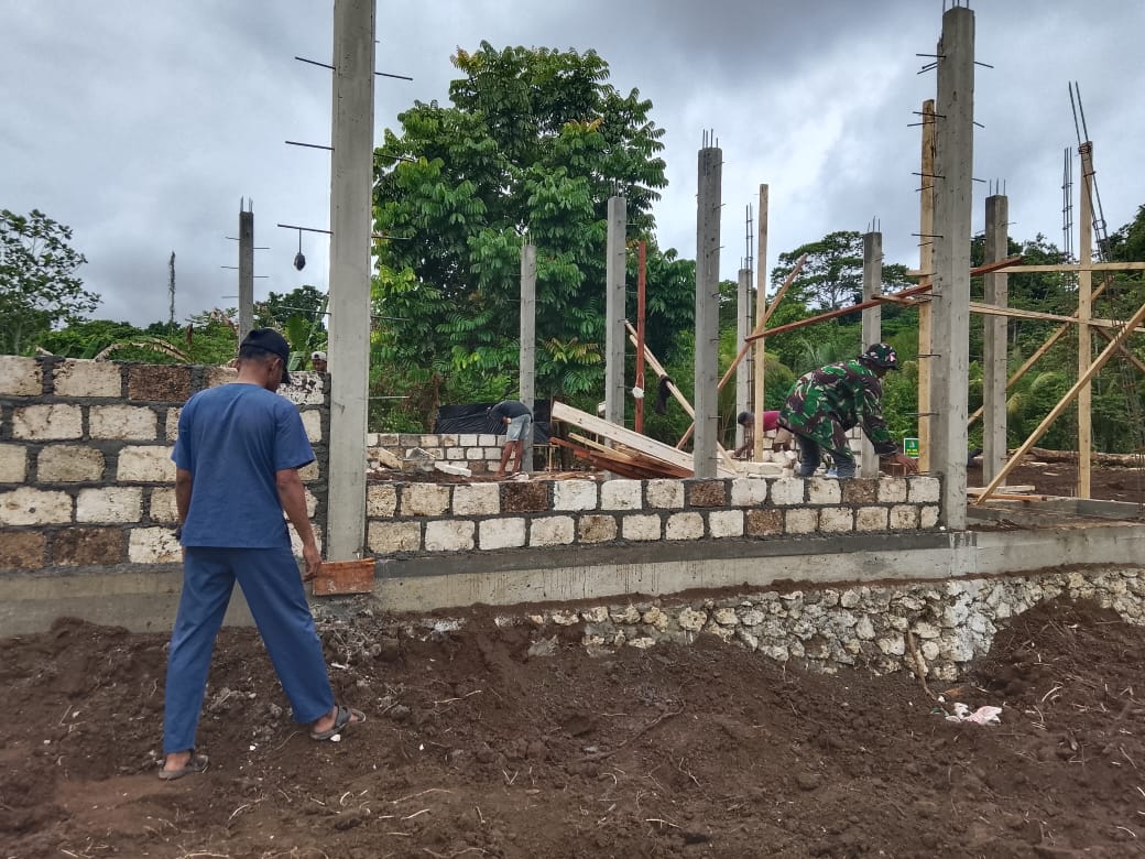 Satgas TMMD Kodim 1712/Sarmi bersama warga setempat bekerja sama untuk melanjutkan pemasangan dinding batu tela pembangunan gereja. Kegiatan ini merupakan bagian dari upaya meningkatkan kesejahteraan masyarakat dan memperkuat kebersamaan antara TNI dan masyarakat.