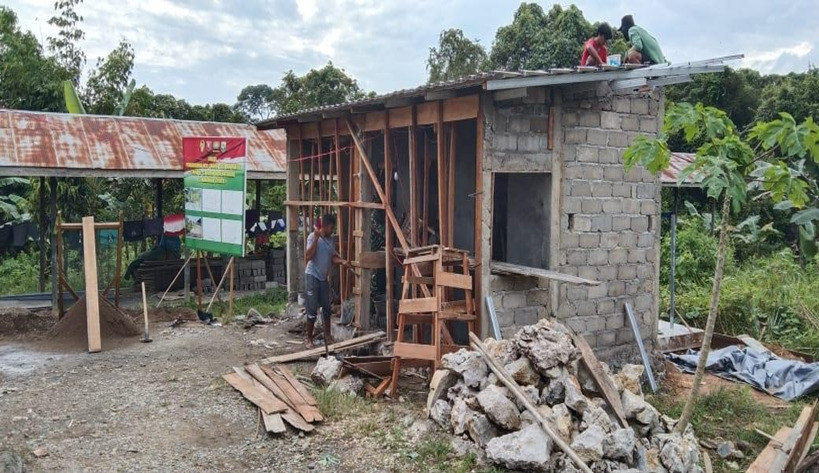 KOTABARU – Personel Satgas TMMD ke 112 Kodim 1004/Kotanaru Sertu Yudi P dan beberapa anggota serta bersama warga melanjutkan pekerjaan memasang Atap Baja Ringan MCK di Desa Manunggul Baru Kecamatan Sungai Durian Kabupaten Kotabaru. minggu(03/10/2021)