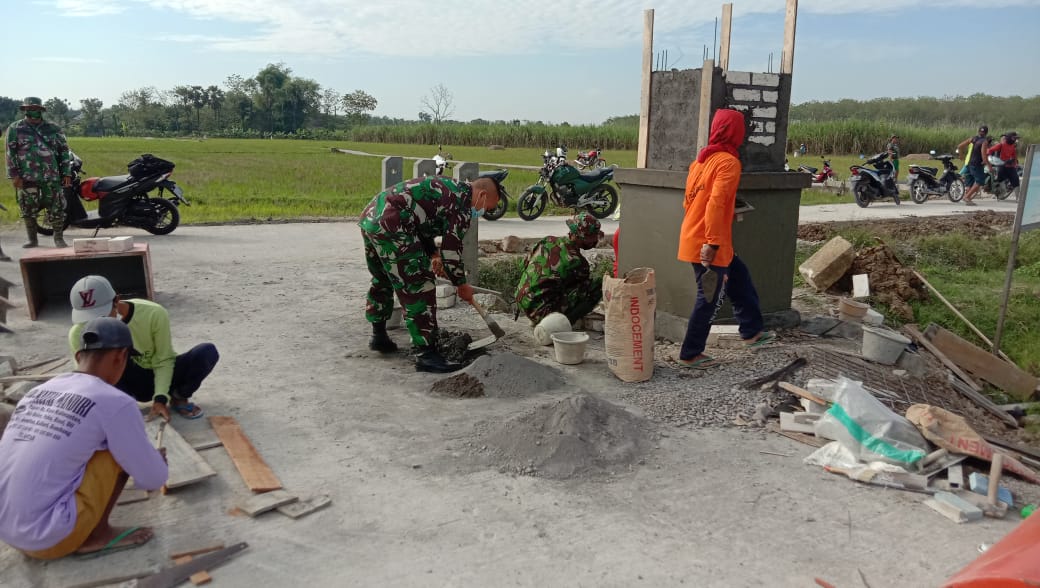 Anggota Satgas TMMD kebut pengerjaan pembuatan Tugu Prasasti yang berada dilokasi sasaran utama rabat beton jalan desa program TMMD Reguler Ke -111 Desa Tamansari, Kecamatan Jaken, Kabupaten Pati.