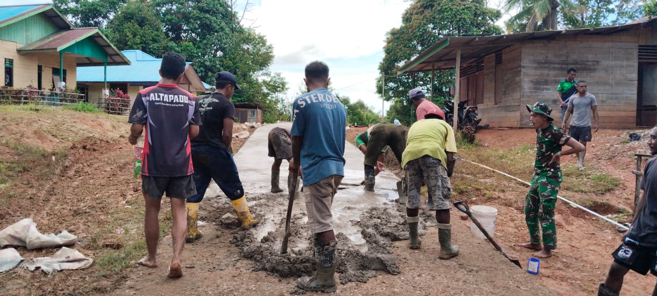 Boven Digoel – Pengecoran jalan yang menjadi sasaran utama dalam program TMMD ke-126 Kodim 1711/BVD terus berlanjut. Para personel Satgas bersama masyarakat Kampung Waropko bahu-membahu melanjutkan proses pembangunan dengan penuh semangat.
