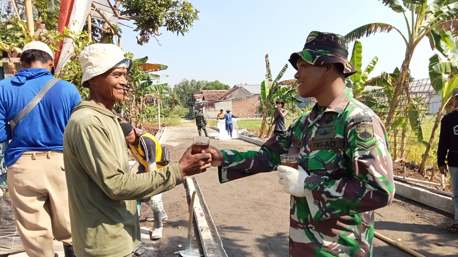 Sembari mambawa segelas teh manis, Serda Gunarto memberikan kepada Suharno (47 Th) salah satu warga masyarakat Kp.Balong Baru Kelurahan Banjarsari Kecamatan Banjarsari yang berada di Lokasi Pengecoran jalan.