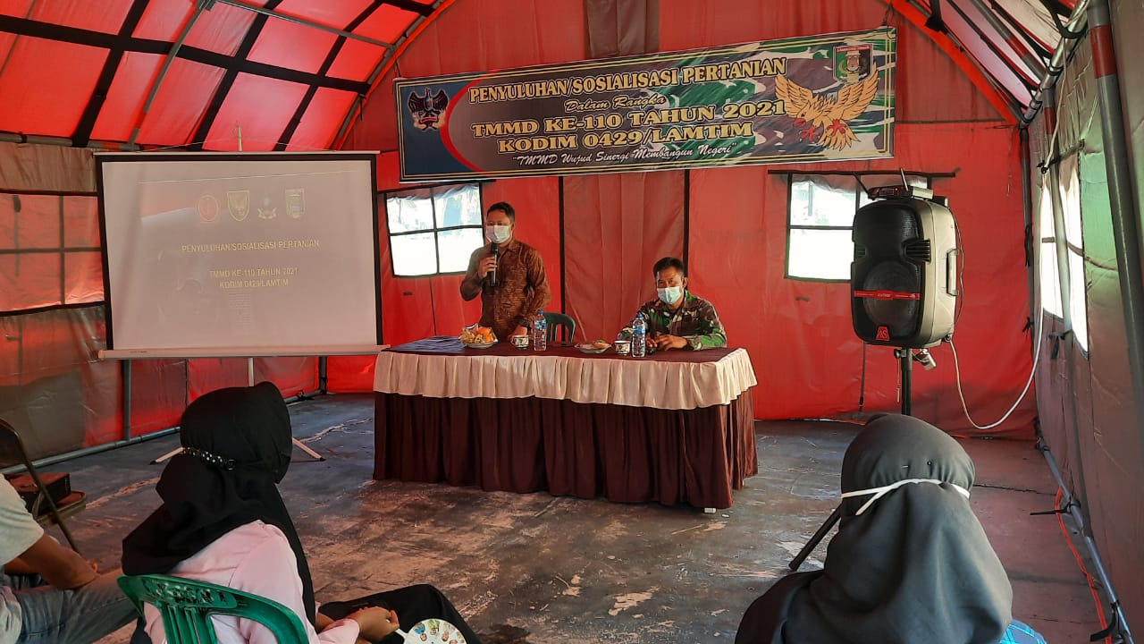 Lampung Timur, Sasaran Non Fisik Tentara Manunggal Membangun Desa (TMMD) ke-110 Kodim 0429/Lamtim dalam rangka mendukung program ketahanan pangan menggelar penyuluhan pertanian kepada masyarakat Desa Sukorahayu, Selasa (30/3/2021).