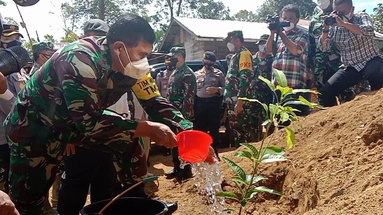 Ketua Tim Wasev TMMD ke 111 Kodim 0212/TS yaitu bersama Forkopimda Tapsel berkunjung ke titik nol lokasi pelaksanaan TMMD serta penanaman pohon bertempat di Desa Siuhom Kec Angkola Barat, Kab Tapanuli Selatan, Asops Kasad Mayjen TNI Eka Wiharsa, Jum’at (2/7/20210 mengatakan menaman tanaman pohon dan buak di titik nol percantik jalan desa.
