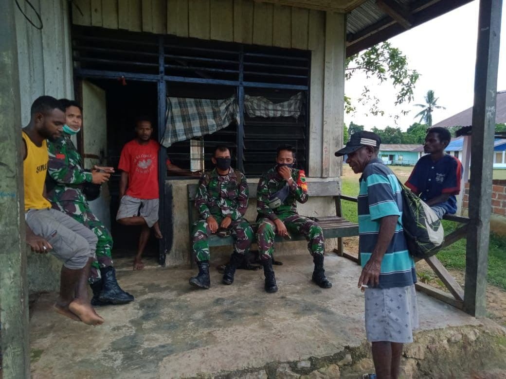 Sorong Papua Barat– Menjaga kesehatan dimasa pandemi, Babinsa Koramil Persiapan Sayosa Kodim 1802/Sorong. Sertu Indra melaksanakan komunikasi sosial bersama keluarga Pak Hans warga Kampung Yorbes, Kelurahan Sayosa, Distrik Sayosa, Kabupaten Sorong. Selasa(19/10/2021).