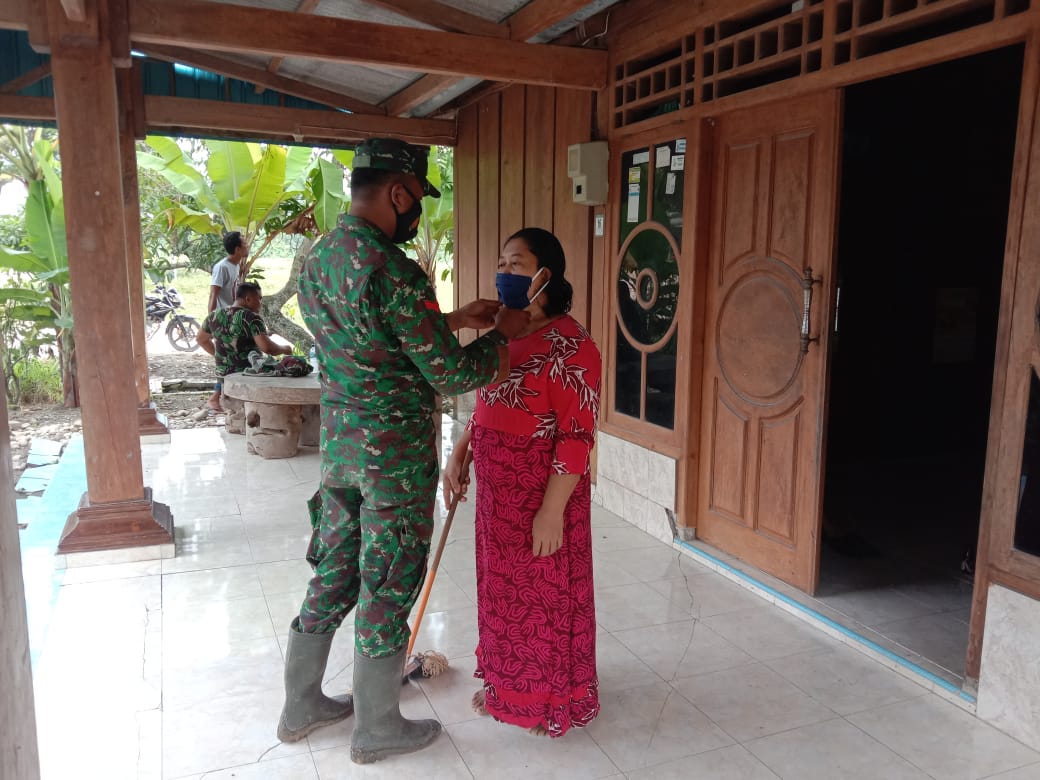 Mengetahui hal tersebut Koptu Mufti tak tinggal diam langsung datang ke warga tersebut dan memberikan masker serta memakaikannya.