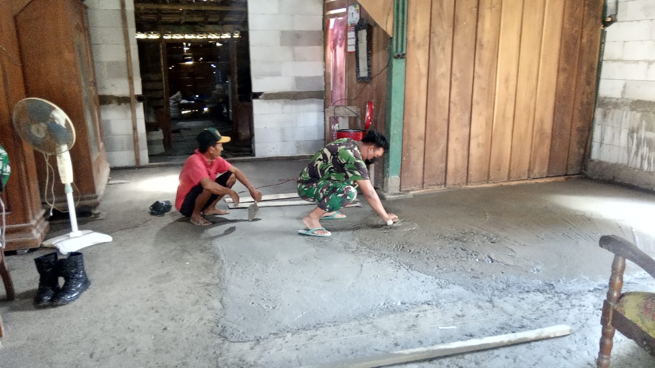 Sertu Jupri membantu ngrabat lantai rumah RTLH yang sudah berjalan kurang lebih 75 persen. “Saya sedang membantu melakukan pemasangan lantai dasar,” ujar Sertu Jufri,Rabu(17/03/2021).
