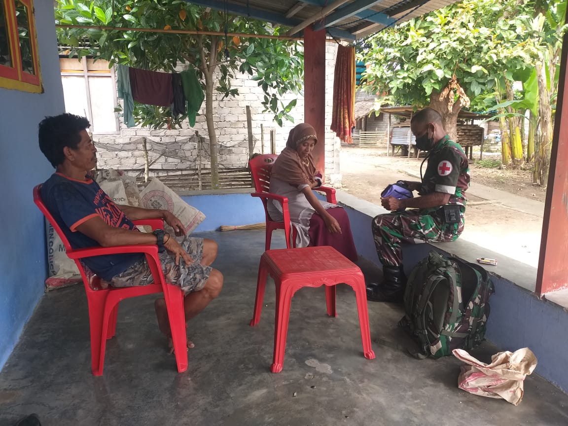 Kopda Sutris personel RST TK-IV Ternate yang tergabung dalam Satgas TMMD Reg ke-111 Kodim 1501/Ternate selaku tim kesehatan melaksanakan pemeriksaan kesehatan gratis bertempat di Posko Lapangan Kelurahan Tafaga Kecamatan Moti.