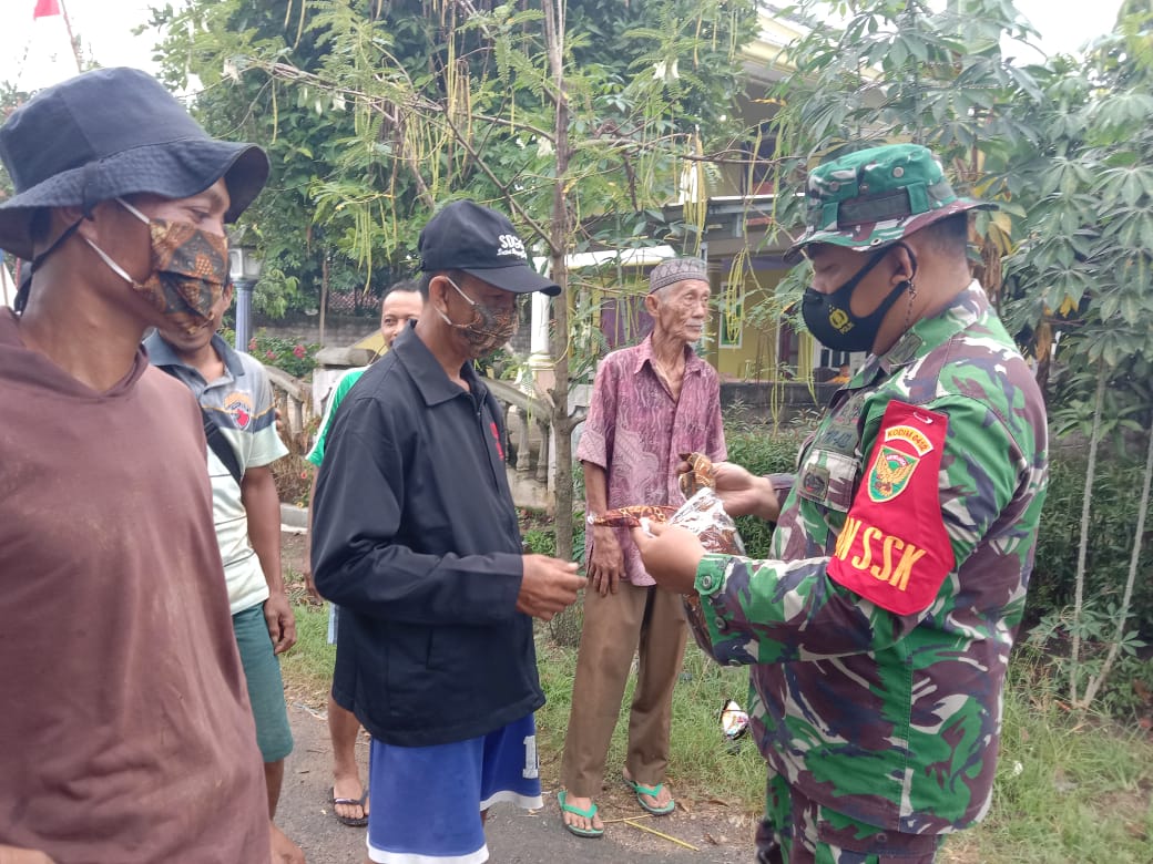 Lampung Utara – Satgas TMMD Reguler Ke-111 Kodim 0412/LU membagikan masker dan melakukan himbauan kepada warga yang melintasi, beristirahat, di Lokasi TMMD, Sabtu (19/06/2021).