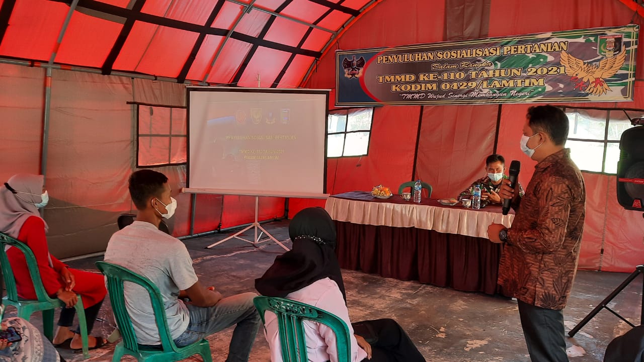 Lampung Timur, Sasaran Non Fisik Tentara Manunggal Membangun Desa (TMMD) ke-110 Kodim 0429/Lamtim dalam rangka mendukung program ketahanan pangan menggelar penyuluhan pertanian kepada masyarakat Desa Sukorahayu, Selasa (30/3/2021).