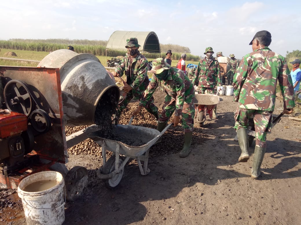 Pati – Program TNI Manunggal Membangun Desa (TMMD) Reguler Ke-111 Kodim 0718/Pati di Desa Tamansari, Kecamatan Jaken, Kabupaten Pati, sudah memasuki minggu ke 2 pengecoran jalan dilaksanakan oleh anggota Satgas bersama-sama dengan warga Desa Tamansari penuh semangat, mengawali pagi secara bergantian membawa adonan cor dengan menggunakan alat angkong ke titik pengecoran. (27/06/2021)