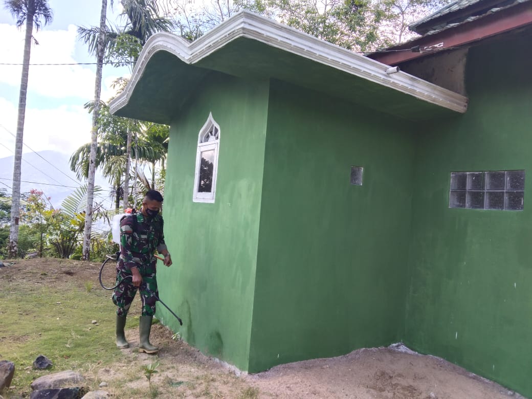 Prada Andi Logita anggota Satgas TMMD ke-111 dengan Dansatgas TMMD Letkol Inf Rooy Chandra Sihombing, S.I.P, di lokasi Desa Siuhom,Kec. Angkola Barat, Kab.Tapsel, Sabtu (19/6/2021), mengatakan lakukan penyemprotan di ruangan Poskotis TMMD.