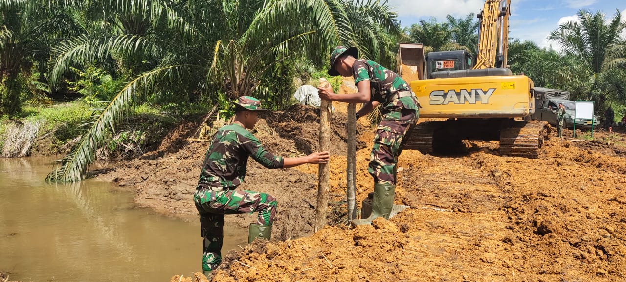 Tanah Laut – Personel Yonif 623/Bhakti Wira Utama Kompi Senapan C yang tergabung dalam Satgas TMMD ke-111 Kodim 1009/Tanah Laut, bahu membahu memasang siring kayu penahan tanah uruk untuk Box Culvert. Dusun Riam Pinang Kel. Tanjung Kec. Bajuin Kab. Tanah Laut, Rabu (30/06/2021).